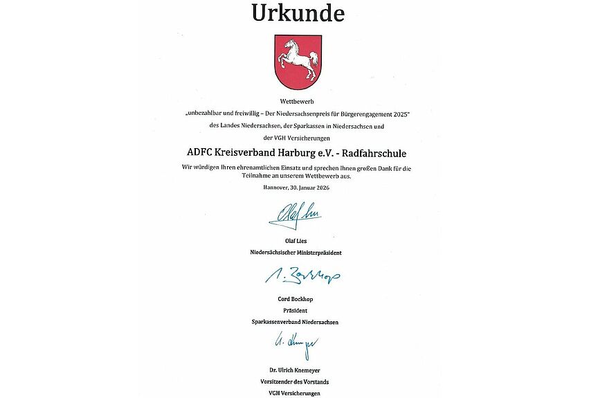 Zum wiederholten Mal wurde der Radfahrschule des ADFC Kreis Harburg eine Ehrenurkunde des Landes Niedersachsen verliehen.
